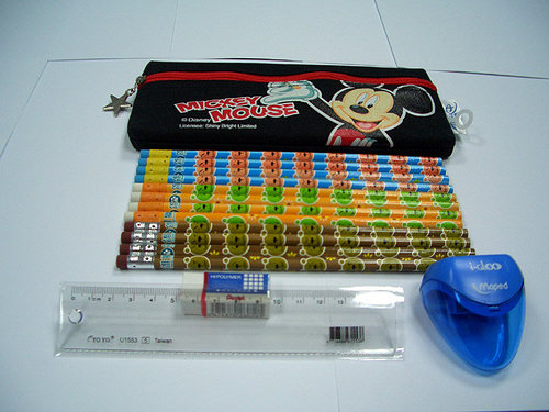 鉛筆盒介紹=>媽咪準備了黑色米奇筆袋,媽咪說這樣就不怕筆袋弄髒,裡面裝了12支鉛筆.橡皮擦.尺及削鉛筆刀,希望哥哥姐姐會喜歡