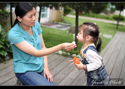 有春媽非常慈愛的幫有春妹拿泡泡棒.